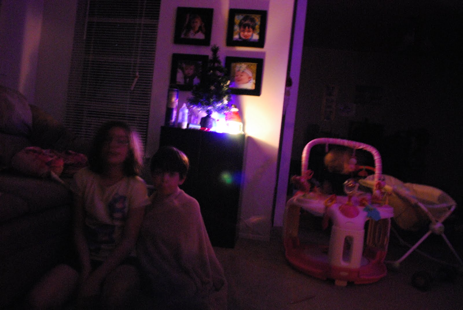 he was brave enough to use the bbq grill as a source of fire to light those two candles. and he knew where the box of partylite candles were, too. I had gotten all the kids to the living room, where I thought of our little battery operated Christmas decorations that flash colors (thank you 99¢ store) and I got those turned on. I then got both Zoey and Liam into some warm jammies - since we wouldn't have heat. soon daddy had us all set up with the two laptops for light - and I gave them my ipod to watch the one episode of Adventure Time that I had on there!